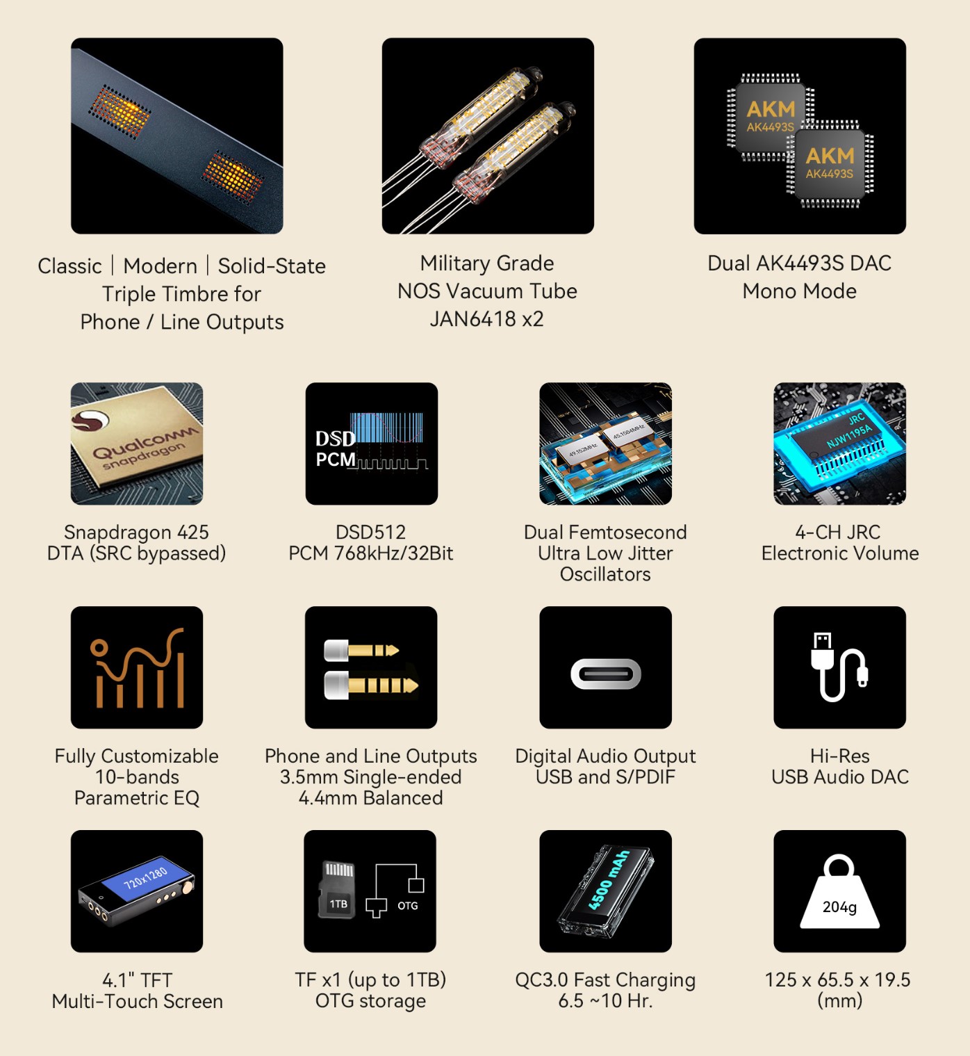 - Reinheit und Dynamik: Die Dedizierung von zwei AKM-Modulen und die dreifache lineare Stromversorgung (FIA) gewährleisten eine D/A-Wandlung mit extrem niedrigem Rauschen und geringer Verzerrung. Das Design sorgt für eine kristallklare Bühne und eine maximale Signalreinheit.