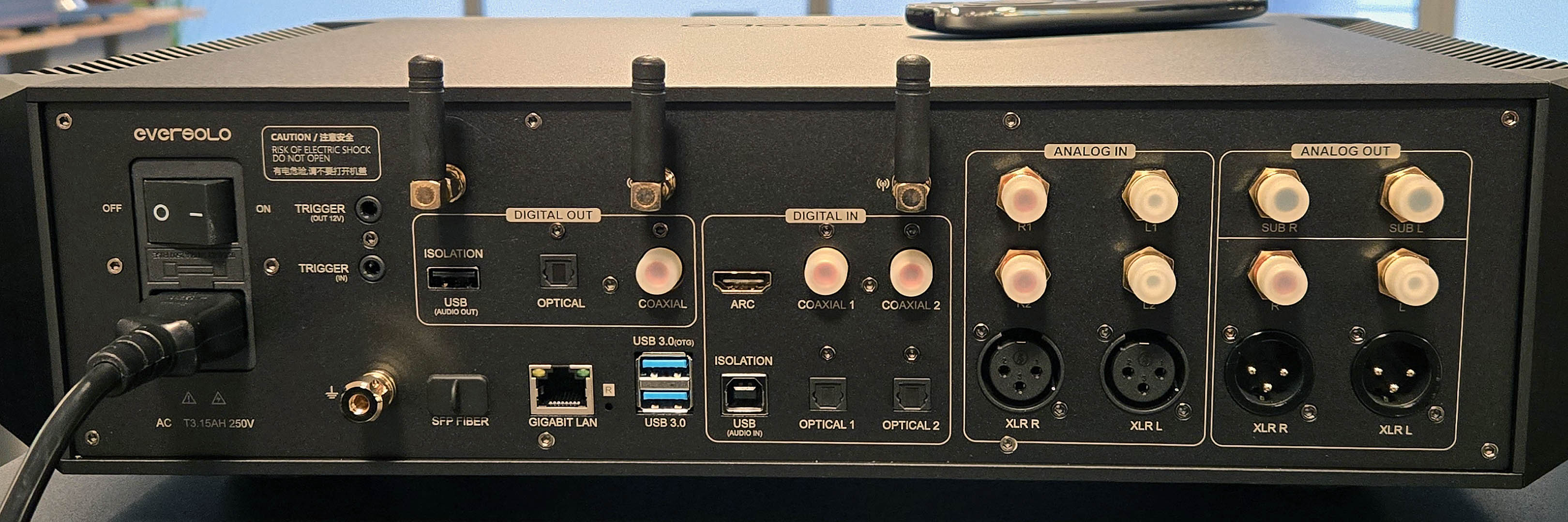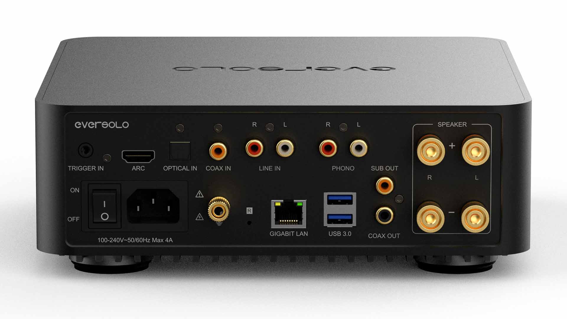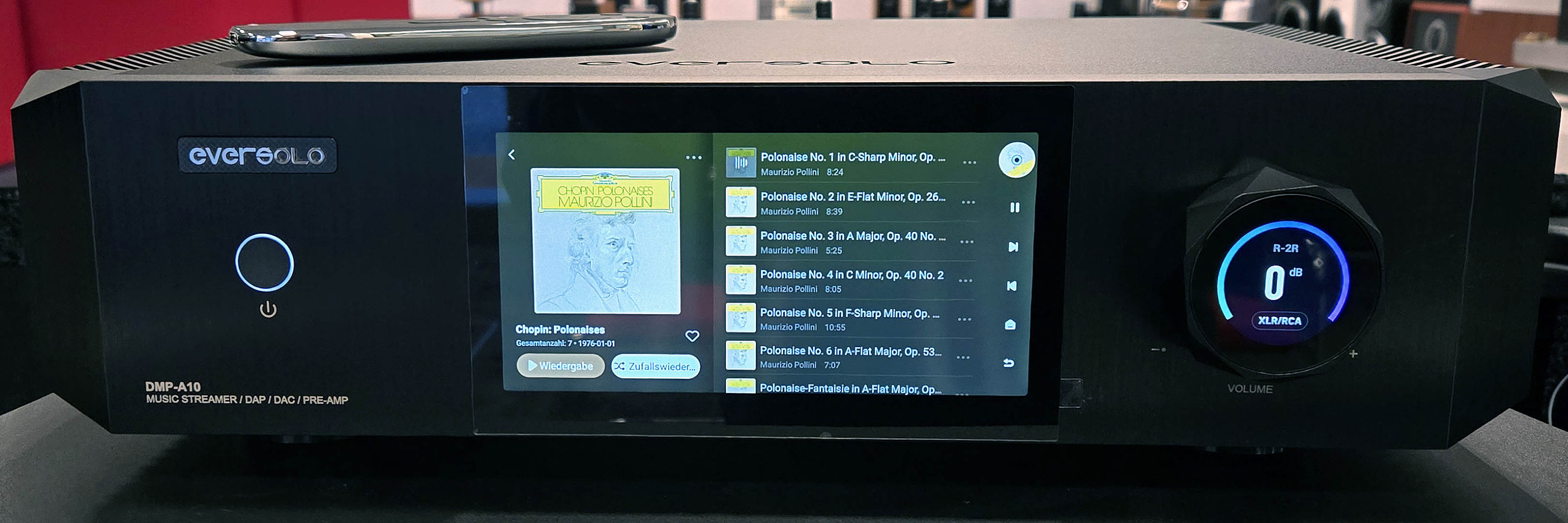 - Steuerung: Touchscreen, Fernbedienung, mobile App (Eversolo Control App), Drehregler