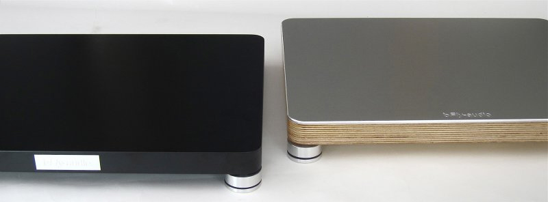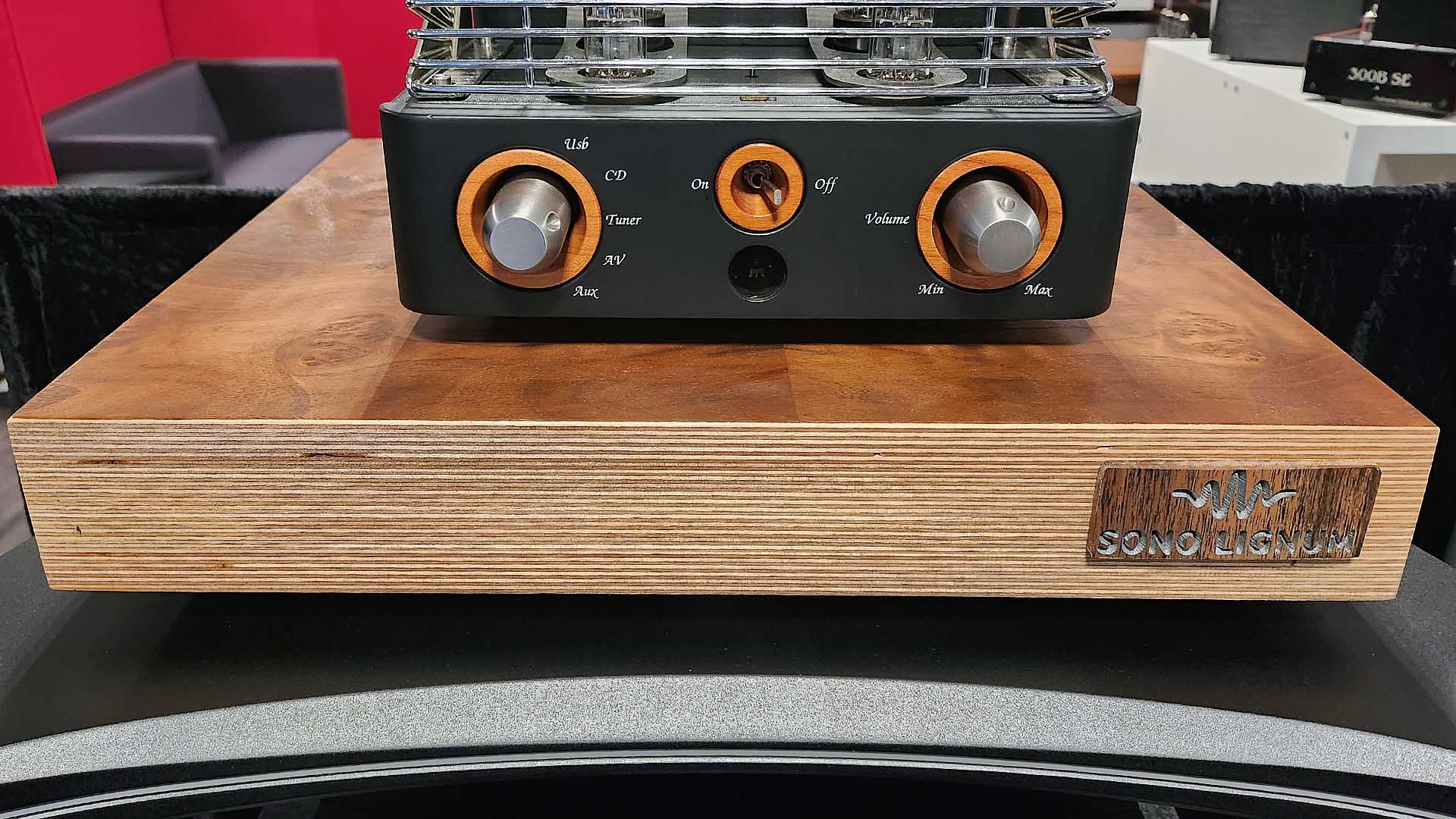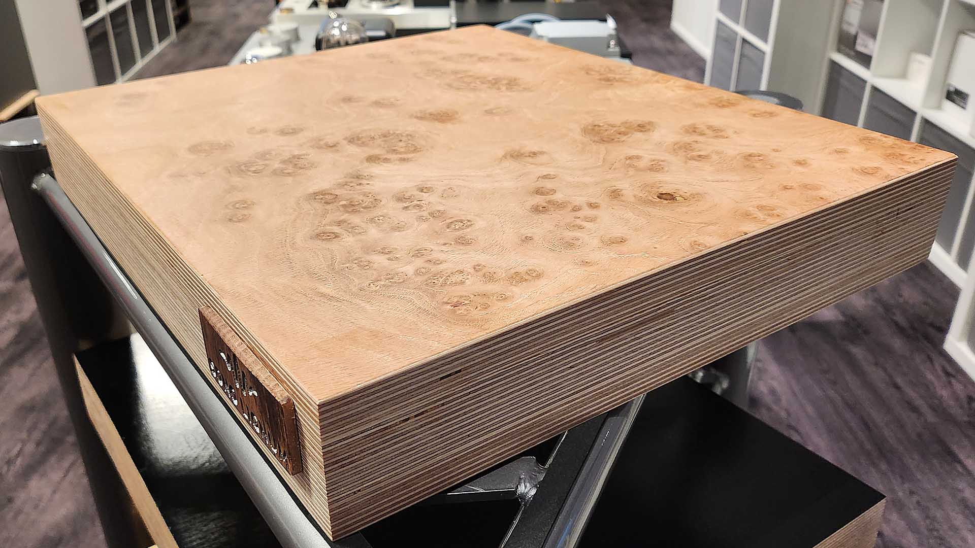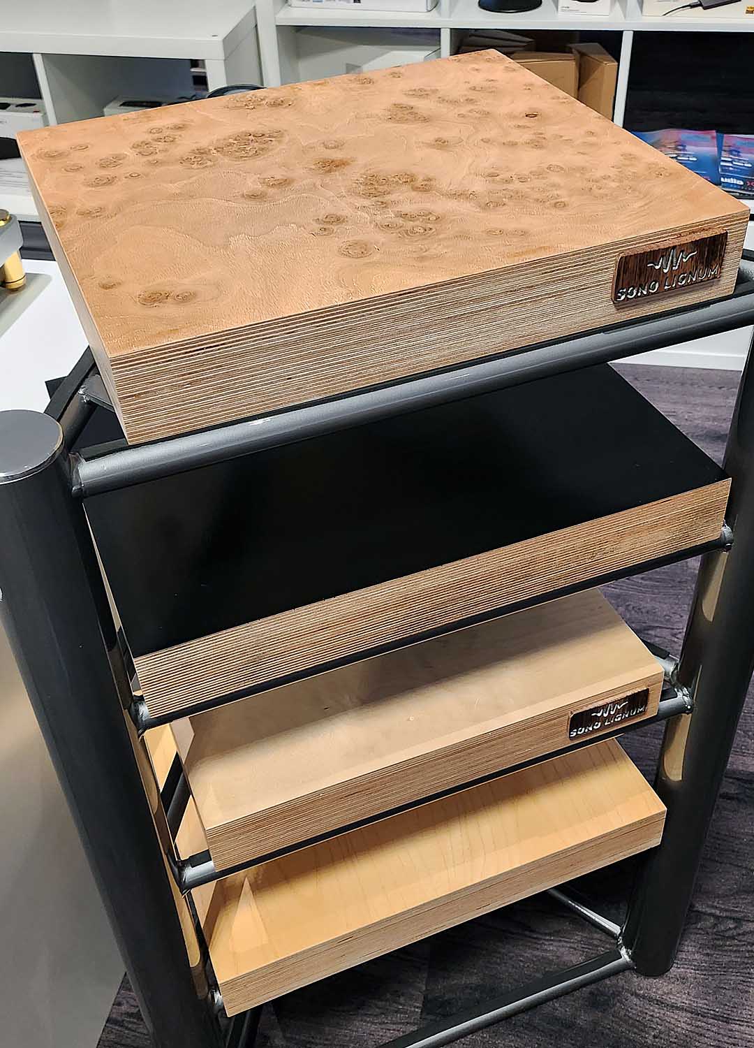 Ein Newcomer aus Deutschland: Sono Lignum fertigt in Franken massive Gerätebasen aus drei Schichten Birken-Multiplexholz. Die mittlere Lage ist kunstvoll ausgefräst, die dadurch entstehenden Aussparungen werden mit Quarzsand, Bleischrot oder auf Wunsch auch mit anderen Materialien gefüllt.