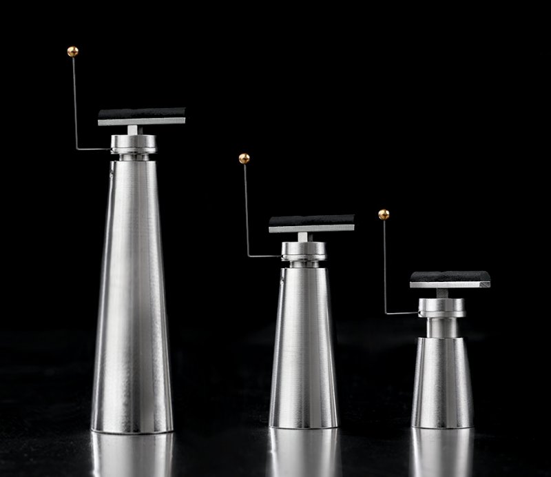 Alle Basen haben ein Dicke von 6,4 Zentimetern. Breite und Höhe sind in beliebigen Abmessungen nach Kundenwunsch erhältlich. Mit den mitgelieferten Holzfüßen beträgt die Gesamthöhe 8,3 Zentimeter. Die Holzfüße sind über ein M6-Gewinde auf der Unterseite eingeschraubt. Bei Bedarf sind also auch Konfigurationen ganz ohne Füße, mit Spikes oder Lösungen von Drittanbietern möglich. Gewicht je nach Ausführung und Größe ab 10 Kilogramm aufwärts.