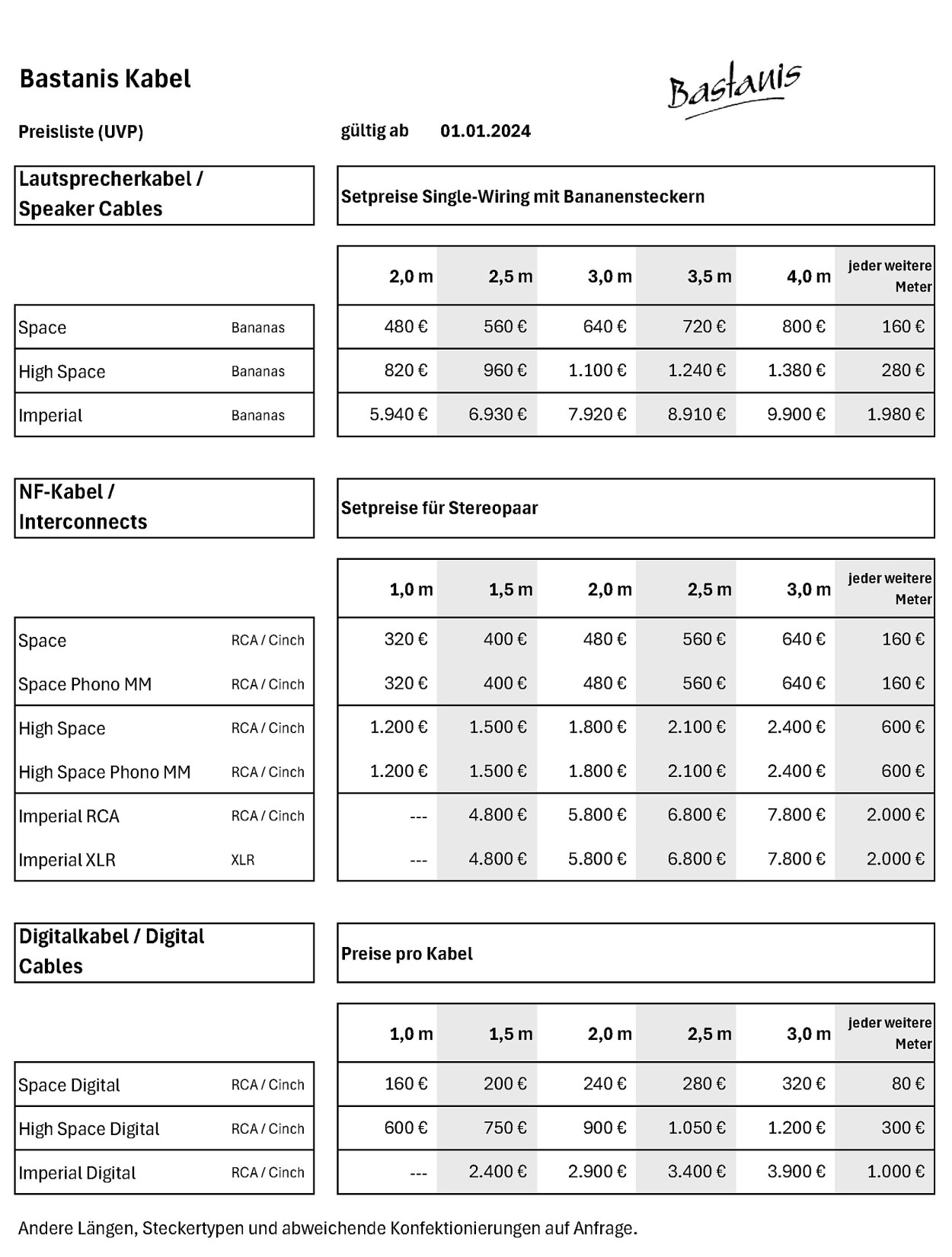 Von Bastanis gibt es derzeit drei Kabelserien für verschiedene Ansprüche: Das preisgünstige Space, das äußerst hochwertige High Space und als absoluten Überflieger die Serie Imperial.