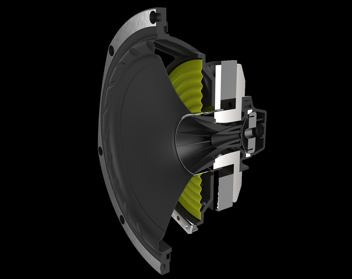 Mitteltonkonus Faserwerkstoff mit FyneFlute™ Randeinspannung, 25 mm Druckkammertreiber, Magnesiumkalotte und Neodymmagnet, 1 x 150mm Faserwerkstoffmembran Tieftöner mit FyneFlute™ Randeinspannung