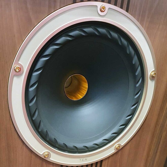 Wie alle Modelle der Vintage-Reihe nutzt auch das Modell “Ten” ein Lautsprecherchassis mit konzentrisch angeordneten Treibern für Tiefmittel- und Hochton. “IsoFlare” nennt man das beim Hersteller, womit man auf die dank Punktschallquelle zeit- und ortsrichtige Abstrahlung über den gesamten Frequenzbereich anspielt. Das Zwei-Wege-System wird im Tieftonbereich durch eine nach unten abstrahlende Öffnung mit der von Fyne Audio patentierten “BassTrax”-Technologie unterstützt.