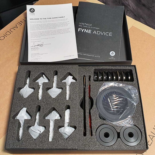 Alle Modelle der Vintage-Serie kommen mit einer Zubehör-Box mit Spikes und passenden Untersetzern, sehr edlen Kabelbrücken für die Bi-Wiring-Terminals und Wachs zur Pflege der Holzoberflächen.