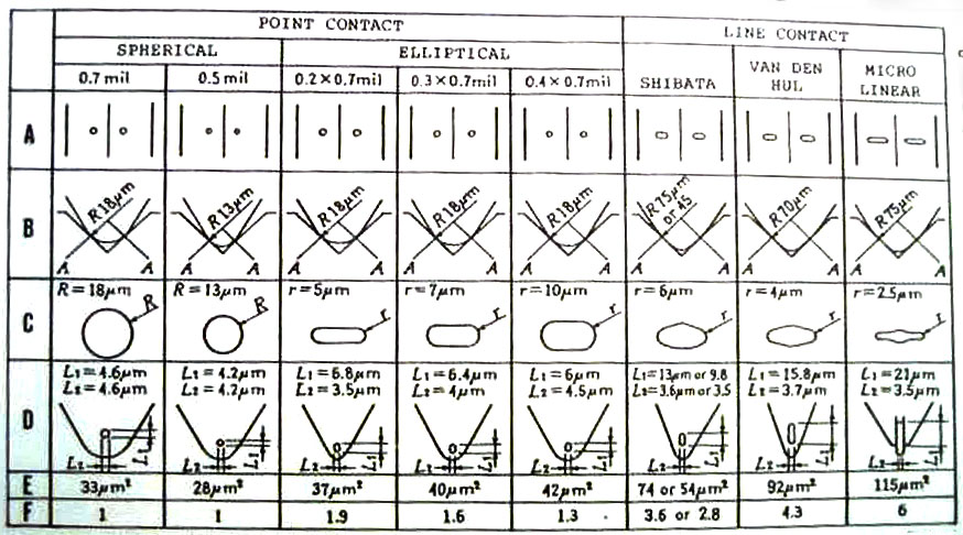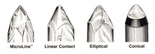 Vergleich unterschiedlicher Nadelschliffe: Im Gegensatz zu den sphärischen und elliptischen Nadelschliffen erreicht der Shibata-Schliff eine deutlich größere Kontaktfläche zur Schallplatte