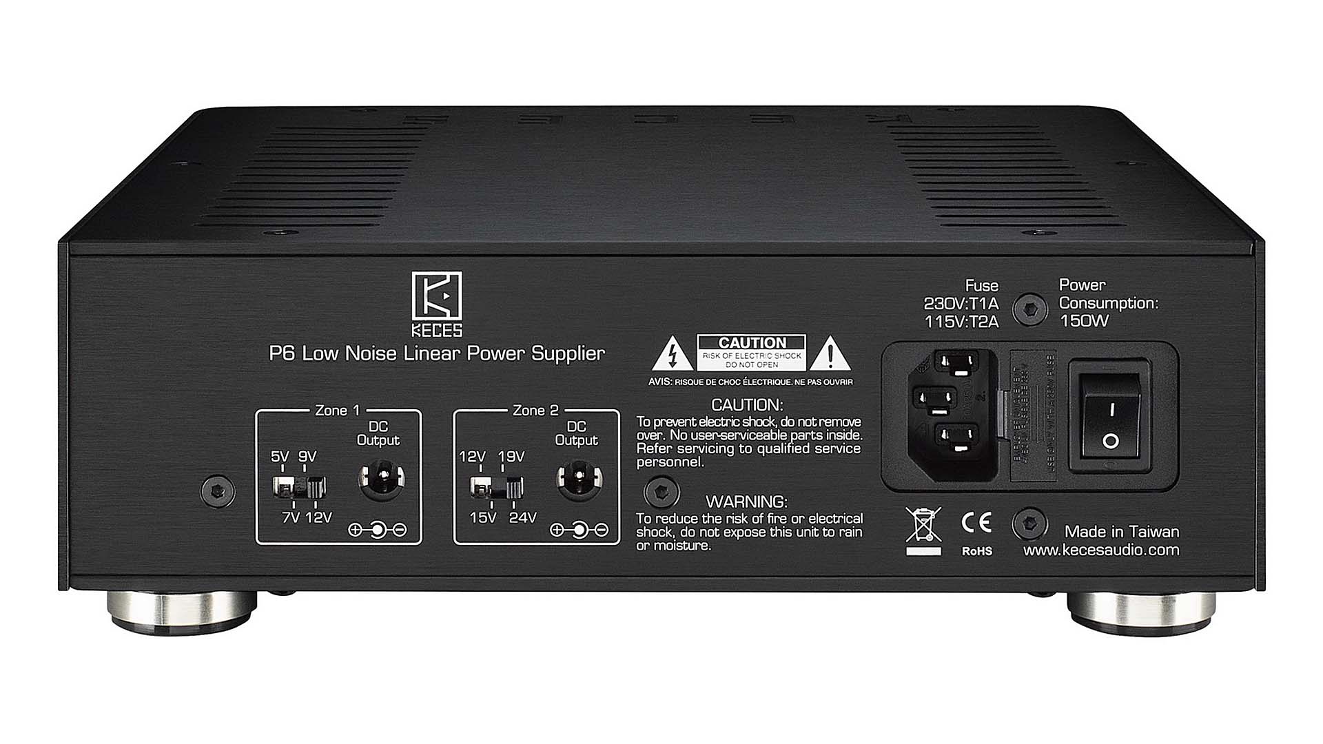 Vom Keces P6 gibt es nur noch eine universell verwendbare Variante. Es werden folgende Spannungen bereitgestellt: Zone 1: 5 / 7 / 9 oder 12 Volt; Zone II: 12 / 15 / 19 oder 24 Volt. Damit ist man bestens für alle Gelegenheiten aufgestellt. Die häufig benötigten 12 Volt (z.B. für NAS, Router, Streamer, DAC) gibt es jetzt gleich zweimal, und auch für alle anderen Geräte sollte man einen passenden Anschluss finden.