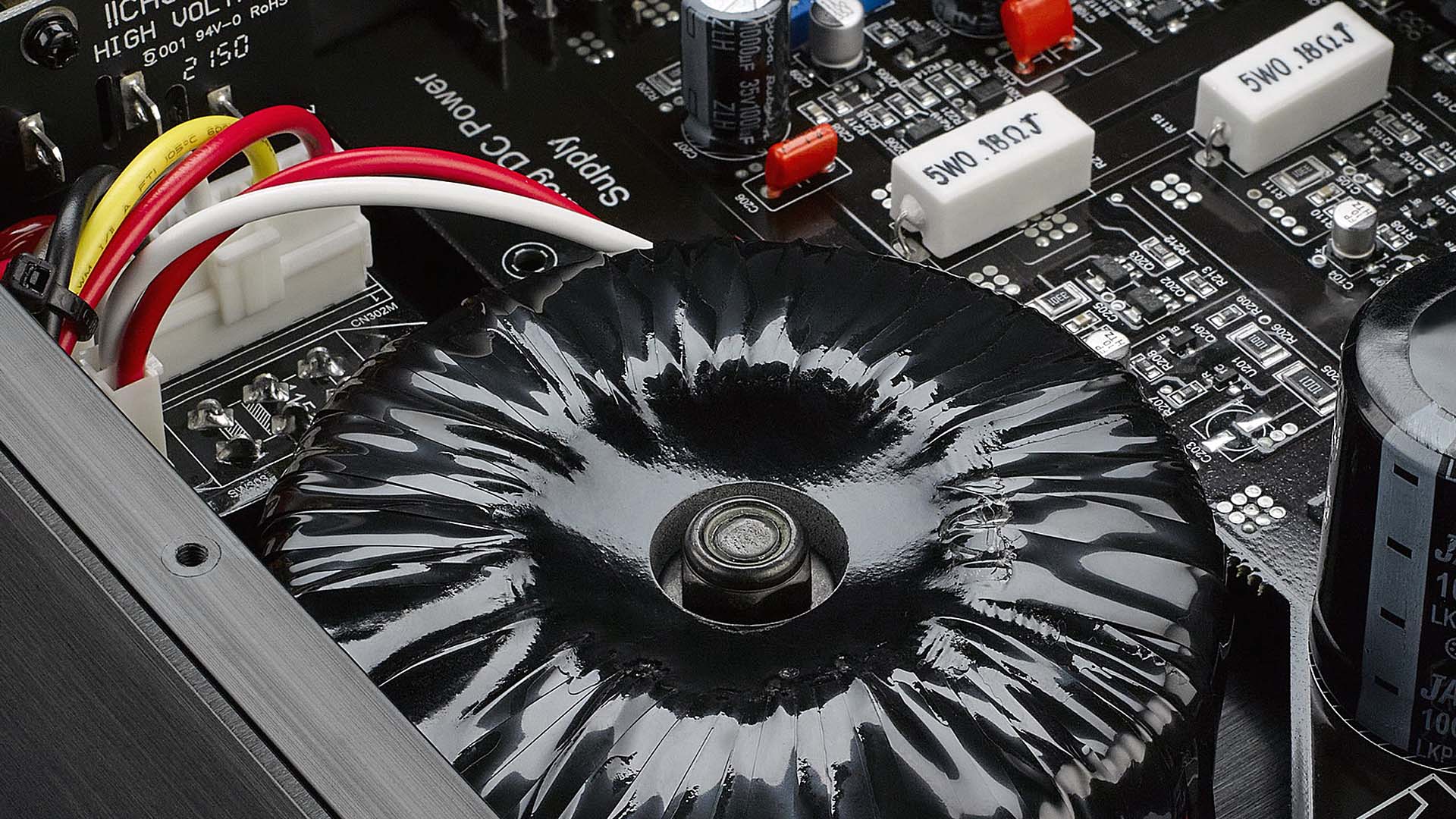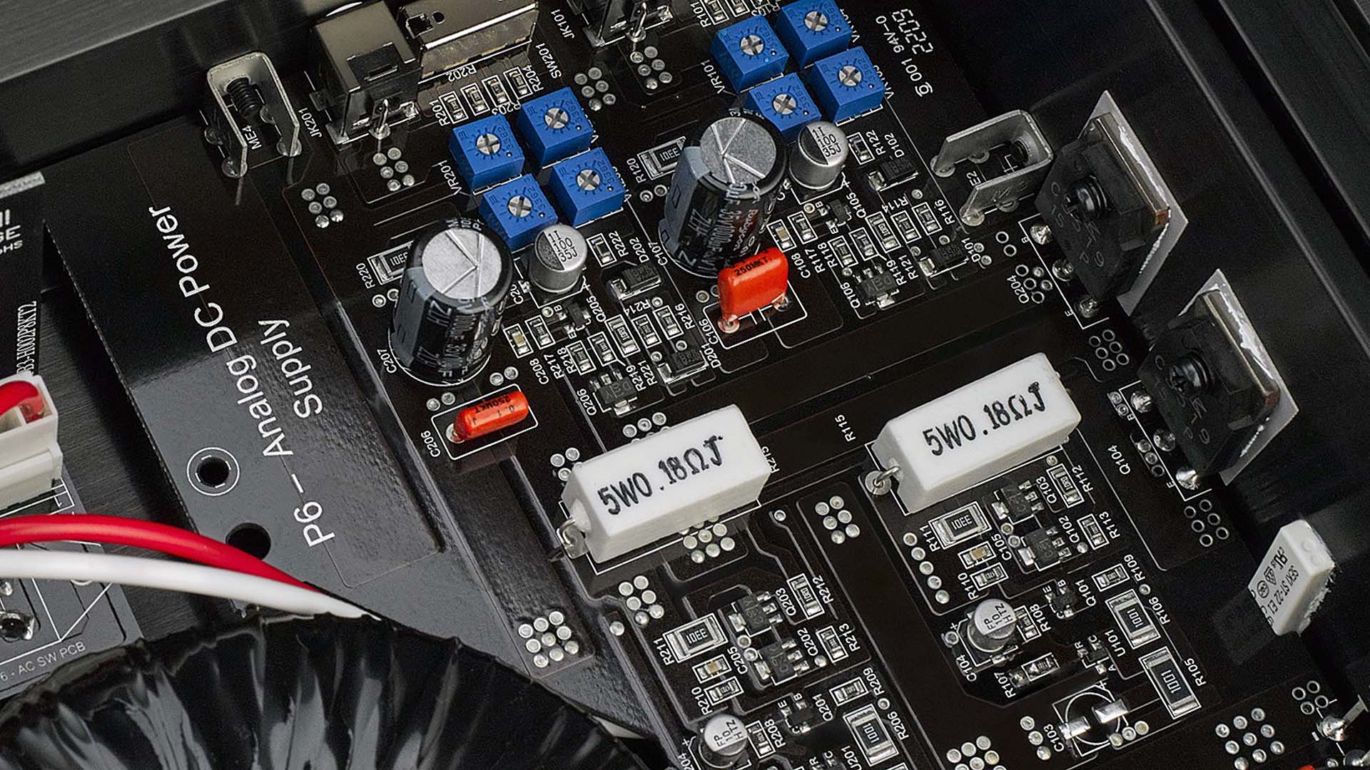 Geblieben sind natürlich der großzügig dimensionierte Ringkerntransformator, die hochwertigen Bauteile (insbesondere auch bei den Kondensatoren), eine überarbeitete Schaltung, die für extrem niedriges Rauschen der Gleichspannung sorgt (und übrigens ganz ohne ICs auskommt), und das geschirmte Gehäuse aus 3 Millimeter dickem gebürstetem, schwarz eloxiertem Aluminium mit Antivibrationsfüßen.
