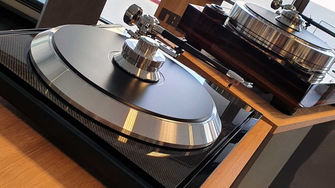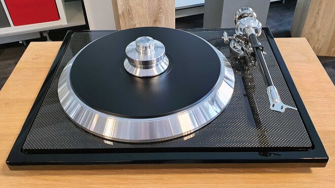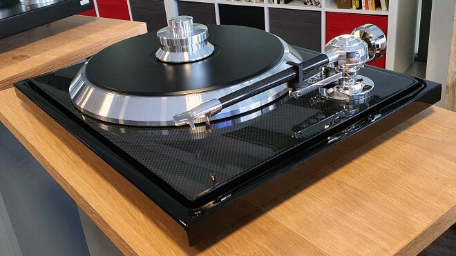 Natürlich glänzt auch der C-Sharp (“Cis”) mit der Subchassis-Zarge mit edler Carbonfaser-Optik. Absetzten gegenüber den kleineren Geschwistern kann er sich mit dem übergroßen Plattenteller, dem C-Note-Tonarm in echter 10-Zoll-Länge, der mikroprozessor-genauen Motorsteuerung und den wirklich durchdachten edlen Plattenauflagewicht.